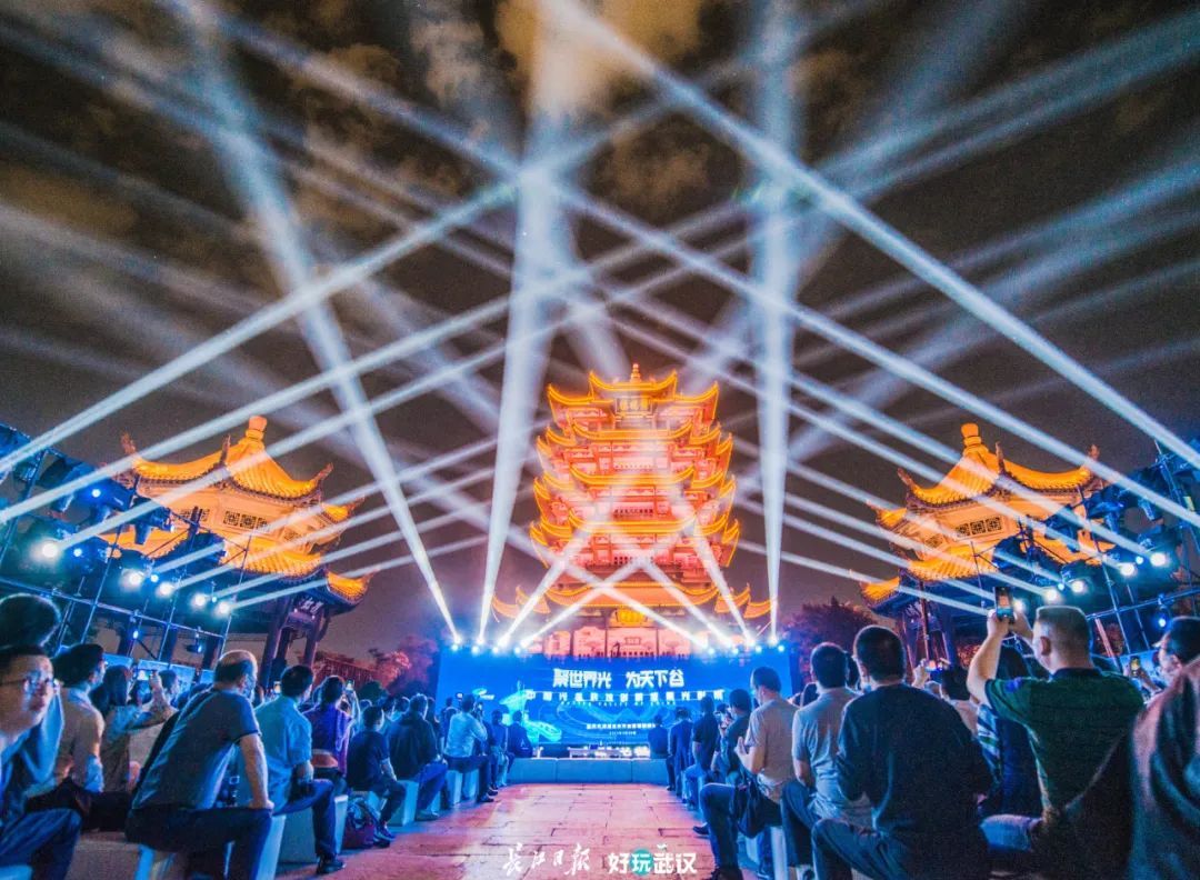 黄鹤楼下,出游的人潮和车流汇聚,刚好一列火车经过,一幅车水马龙的繁荣景象。园博园草莓音乐节上,霓虹彩灯映射着年轻的面庞,这是一片年轻人的世界,这是一片欢乐的海洋。