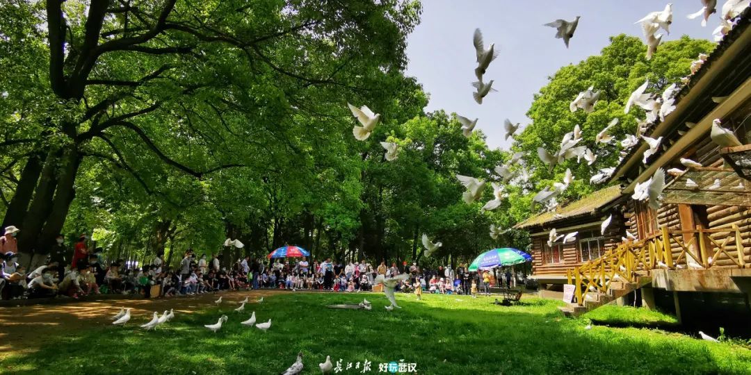 解放公园是闹市区里的一方静土,许多市民来到这里享受大自然。摄影师王芳用无人机鸟瞰汉口解放公园,游船如织、湖光塔影、绿树成荫,船上有年轻人哼唱起欢快的歌儿:让我们荡起双桨,小船儿推开波浪……喂鸽子的孩子们扬手撒出谷物,看鸽群飞舞。