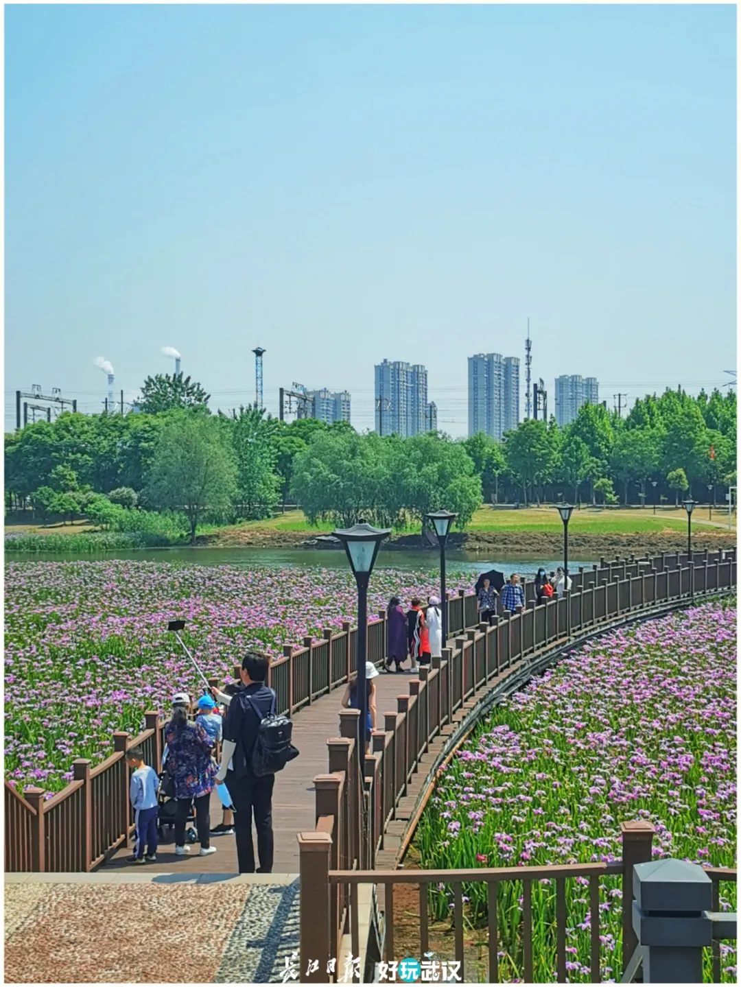 杨春湖公园紧挨着高铁武汉站,之前养在深闺人未识,今年因环湖盛放的水中鸢尾花海,火出了圈,蓝天碧水中摇曳着一片姹紫嫣红,带来美丽的初夏。5月5日,立夏,汉口一居民小区像打开了一把巨大的“花折扇”。