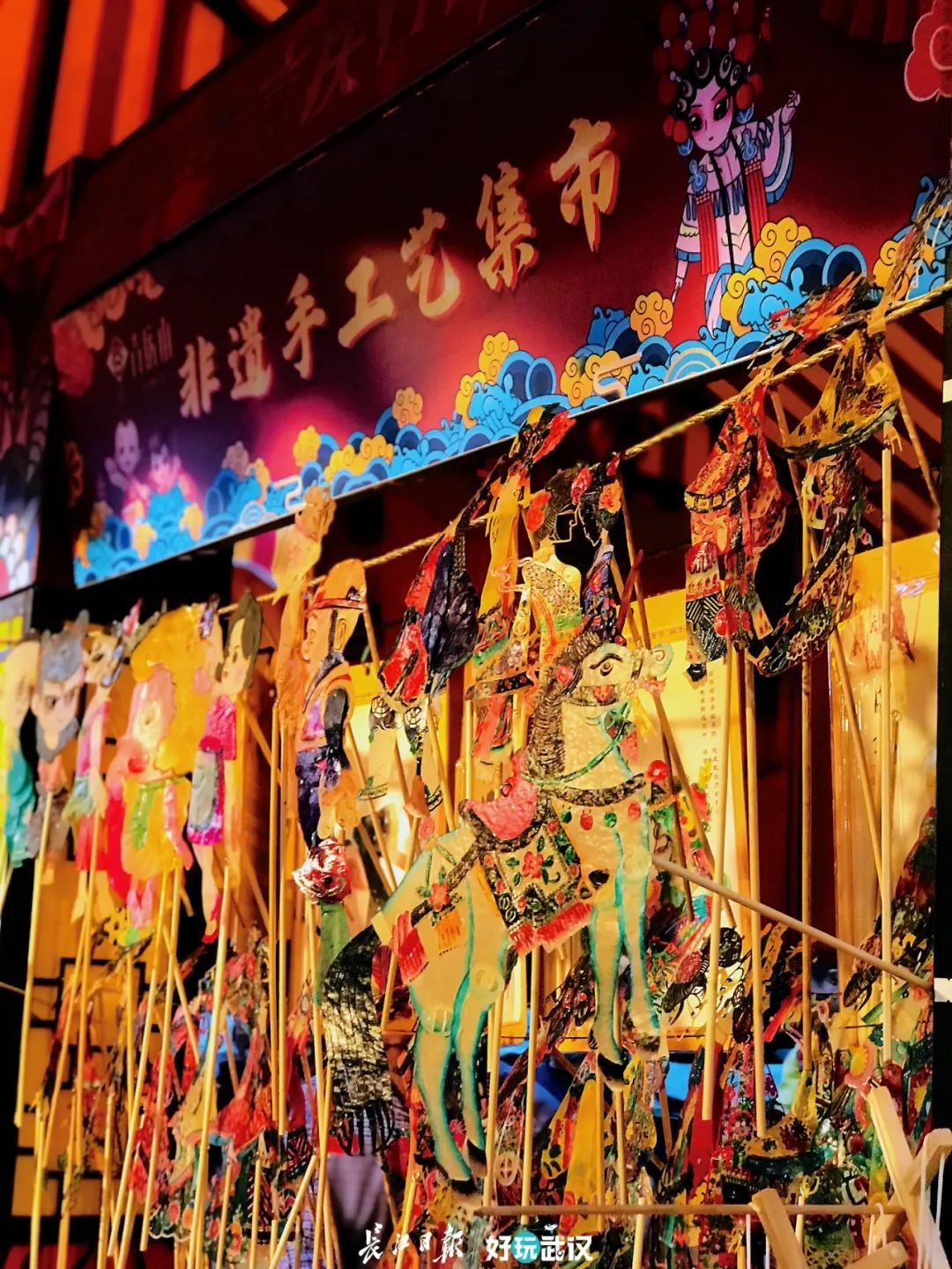 吉庆街的非遗手工艺集市上,形态各异、色彩斑斓的皮影挂在摊位前,吸引外地游客驻足观摩,要等在现场看一出皮影戏才过瘾。