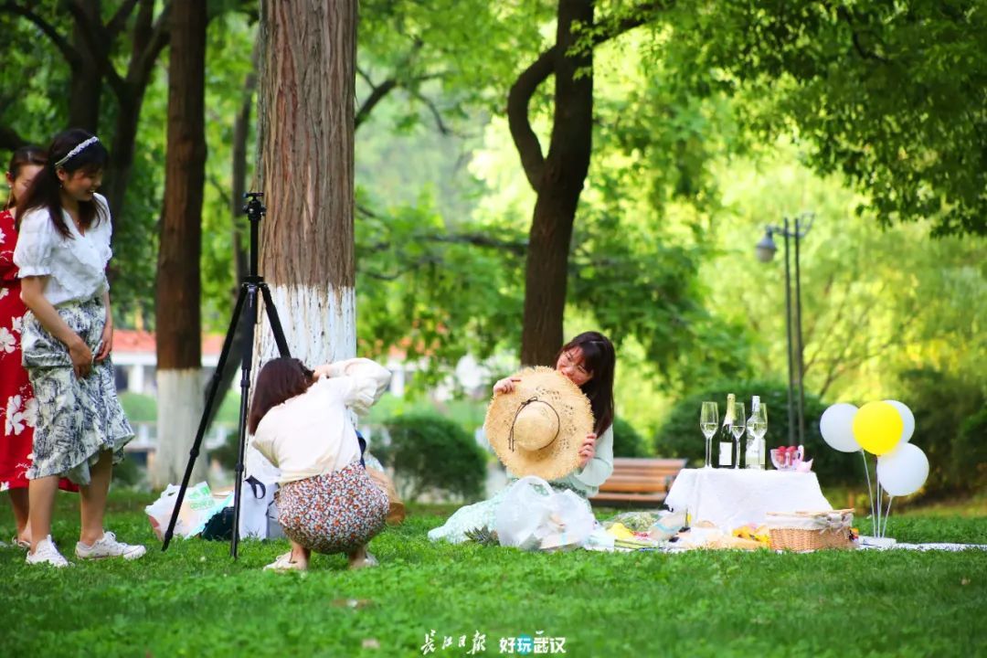 解放公园里,拍写真照的女孩们自备了野餐垫、高脚杯、高架,帽子都挡不住她的满脸笑意。