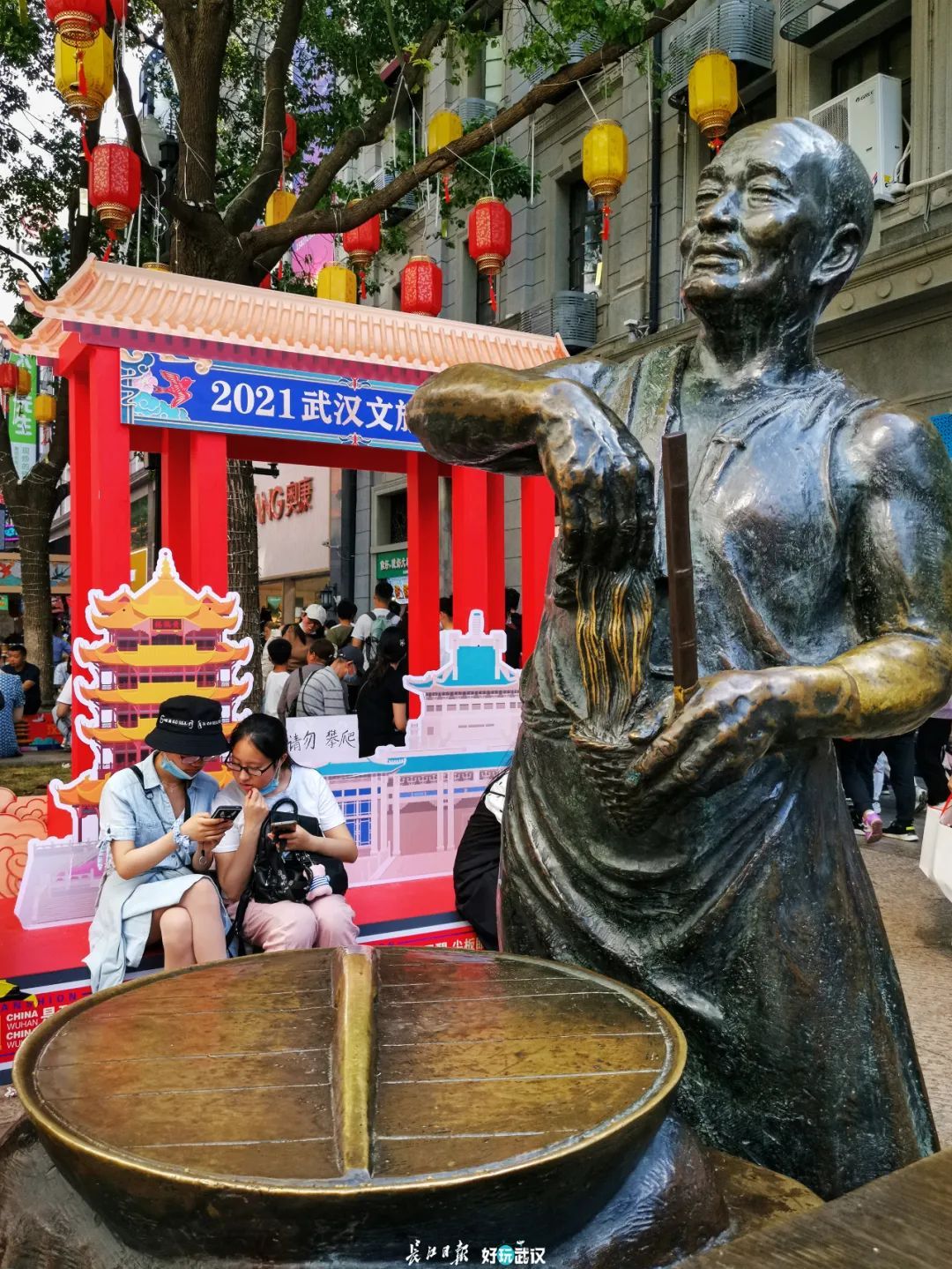 江汉路的热干面雕塑也挺火,两个女孩正坐在雕塑旁边,在手机上看美食攻略,纠结要先吃什么好吃的。
