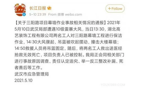 视频中吊篮上工人的命运也牵动着很多人的心。5月10日深夜,武汉市应急管理局通过媒体发布了《关于三阳路项目幕墙作业事故相关情况的通报》。通报中介绍,2021年5月10日武汉局部遭遇10级雷暴大风,当日13:30,湖北高艺装饰工程有限公司两名工人对三阳路幕墙工程进行保洁作业,14:30大风骤起,吊篮被吹起摆动,撞击大楼幕墙;14:50救援人员将吊篮固定,随后,将两名工人救出送医,两名工人经抢救无效死亡。