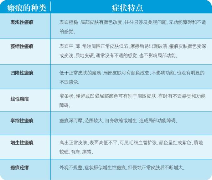 但也会有很少的瘢痕长时间增生,明显高于皮肤表面,并且颜色呈红褐色,质地很硬,有痒、痛或紧绷感,有些瘢痕甚至侵蚀正常皮肤、出现挛缩畸形,或反复破溃影响局部的正常功能,这些瘢痕属于异常瘢痕,需要积极治疗。临床上瘢痕主要类型