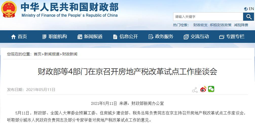 5月11日,财政部、全国人大常委会预算工委、住房城乡建设部、税务总局负责同志在京主持召开房地产税改革试点工作座谈会,听取部分城市人民政府负责同志及部分专家学者对房地产税改革试点工作的意见。