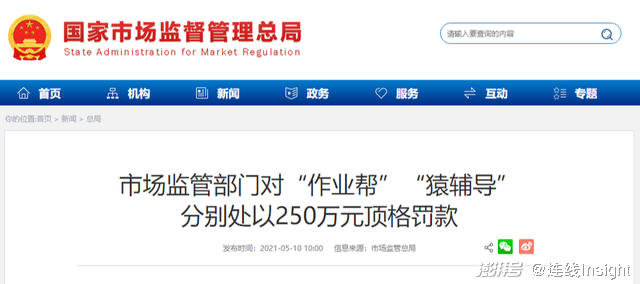 5月10日,北京市场监督管理局对作业帮、猿辅导分别处以250万元顶格罚款,两家头部在线教培企业均被指存在虚假商业宣传、诱骗消费者交易等行为。