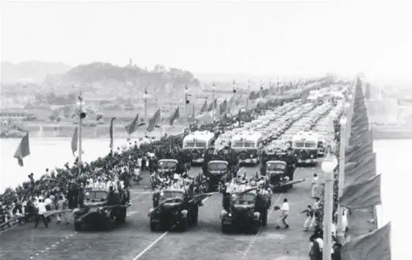 武汉长江大桥提前两年建成,于本日隆重举行落成通车典礼。