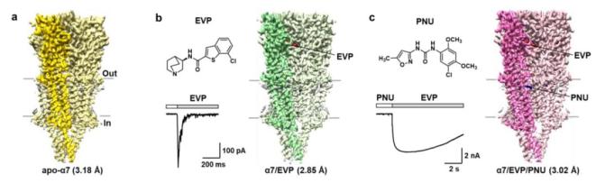 图1. 神经型nAChRs的分类和α7亚型介导的神经传递田长麟团队和刘磊团队通过逐步优化人源α7-nAChR在哺乳动物细胞HEK293中的表达条件,最终获得了正确折叠的具有配体门控离子通道功能的蛋白。该项研究共解析了三种不同条件下的全长α7-nAChR受体结构: apo-状态,激动剂EVP-6124(临床研究药物)和II型正向别构调节剂PNU-120596(临床研究药物)。并通过结构比较,结合前期的大量生理与药理研究数据揭示激动剂EVP, 正向别构调节药物PNU特异性结合并激活α7-nAChR功能的结构基础。