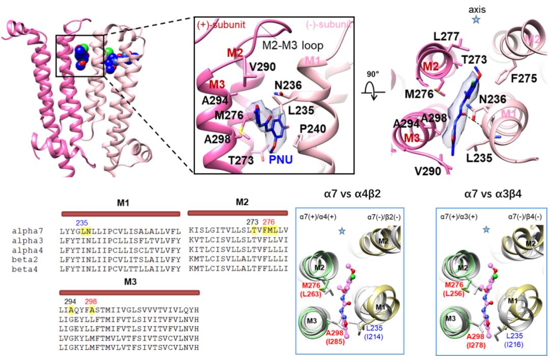 图3. 激动剂EVP-6124选择性结合α7乙酰胆碱受体的结构基础正向别构调节剂PNU-120596对α7乙酰胆碱受体具有选择性的结构基础:PNU-120596结合在跨膜结构域的上半部,位于两个相邻亚基的界面处,这是首次有关PAM结合α7的位置报道。结合口袋的氨基酸位于主亚基上的M2、M3螺旋和M2-M3 loop上,以及互补亚基的M1和M2螺旋上,它们之间的主要是疏水相互作用。比较结合口袋位置其他nAChRs亚型(如α4β2和α3β4)的氨基酸,发现M2上的M276和M3上的A298分别被由Leu和Ile替代,这些被替代的氨基酸与PNU-120596分子之间存在明显的空间位阻作用。因此,M2和M3跨膜螺旋的氨基酸残基多样性可能决定了PNU-120596对不同亚型受体的选择性。