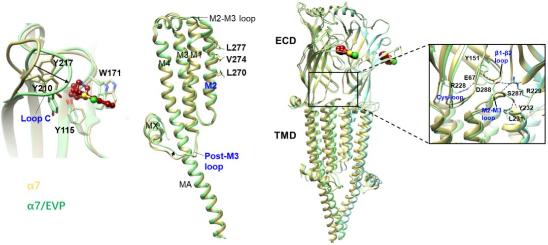 图4. 正向别构调节药物PNU-120596选择性结合α7乙酰胆碱受体的结构基础激动剂EVP-6124激活α7乙酰胆碱受体的结构基础:EVP-6124结合导致受体胞外域的loop C发生明显构象变化,而跨膜结构域的构象变化主要发生在M2螺旋和post-M3 loop上。这种构象变化主要是通过胞外域与跨膜螺旋束之间的耦联区域(包括β1-β2 loop,Cys-loop,pre-M1 loop和M2-M3 loop等)进行传递(图5)。激动剂结合之后,结合口袋附近结构的变化通过耦联区进行构象传递,最终引起M2跨膜螺旋上半部发生向上移动和向外旋转,导致通道的上半部孔道区发生扩张,而下半部孔道区结构无明显变化,通道处于脱敏状态。