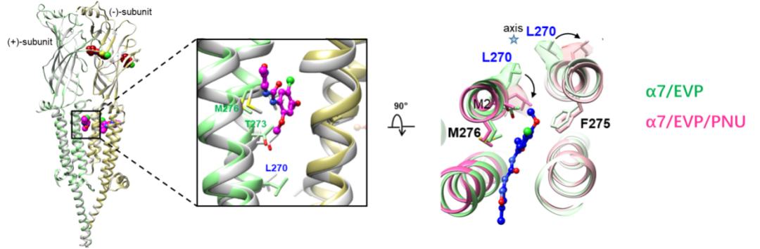 图5 选择性激动剂EVP-6124激活α7乙酰胆碱受体的结构基础正向别构调节剂PNU-120596通过变构效应激活α7乙酰胆碱受体的结构基础:PNU-120596的结合对受体整体结构影响不大。然而,非常重要的一点是,它的结合引起位于结合口袋下方M2跨膜螺旋上的9'-Leu(Leu270)侧链向外旋转约110°。与只跟激动剂结合的受体结构相比,PNU-120596结合后,受体的上半部孔道区的开放程度变大,而孔道下半部几乎保持不变,维持了通道的脱敏或者部分脱敏状态。