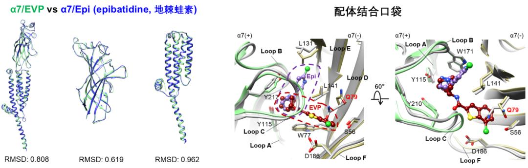 图2. 人源全长α7受体在三种不同状态下的冷冻电镜三维结构激动剂EVP-6124对α7乙酰胆碱受体具有选择性的结构基础:冷冻电镜结构表明,EVP-6124结合在α7胞外域的正构位点上,但是,它在α7受体中的空间取向与尼古丁在其他亚型nAChRs中的取向显著不同。尼古丁分子朝向结合口袋内部,而EVP-6124朝向外部,它们之间形成了约90°的角度差异。进一步对结合部位的氨基酸残基进行比较,发现EVP-6124与尼古丁在神经型nAChRs的正构位点上以几乎相同的主面和不同的互补面结合(图3)。结合口袋中互补亚基的氨基酸差异性可能决定了激动剂的亚型选择性。