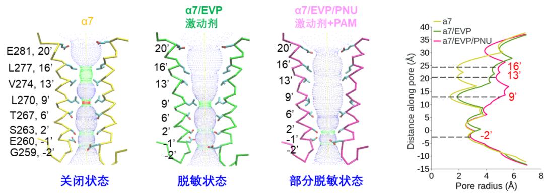 PNU-120596是靶向α7-nAChR的高选择性且能延缓脱敏效应的的正向别构调节剂(PAM)。田长麟和刘磊团队的研究结果表明EVP/PNU结合的α7-nAChR也处于一种部分脱敏的状态,而近期报道的非选择性激动剂epibatidine与PNU结合的α7-nAChR处于一种完全开放的状态 (Cell, 2021, 184:1-14),这表明PAM与不同类型的激动剂协同作用,会对α7的功能状态产生不同的效果。