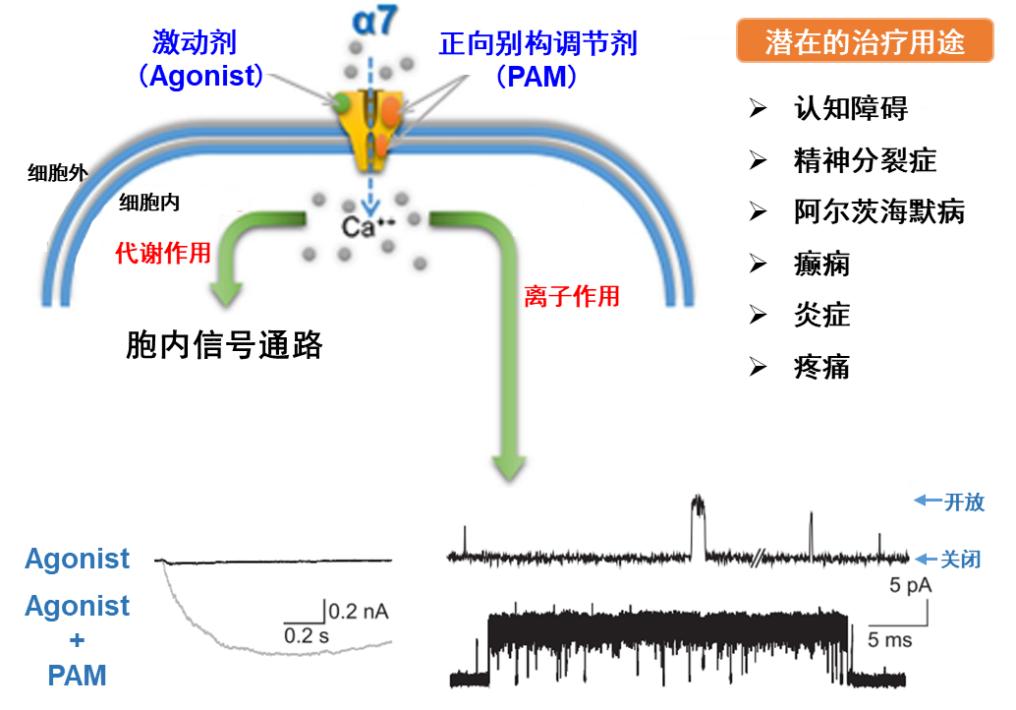 α7功能异常被认为与多种神经系统相关疾病的发生密切相关,如阿尔兹海默病(AD)、认知障碍、精神分裂症等(图1)【1】。研究发现,在AD病人和精神分裂症患者的大脑中α7显著减少;而增强α7的作用在一定程度上能够改善认知功能,因此增强α7活性被认为是治疗AD和精神分裂症等神经系统疾病的有效策略。有证据表明淀粉样蛋白Aβ1-42可以高亲和力的结合α7并影响其功能。α7的激动剂能够激活受体,而正向别构调节剂(positive allosteric modulators,PAM)能不同程度地增强α7的电流,它们已成为α7相关疾病治疗药物研发的重要方向。