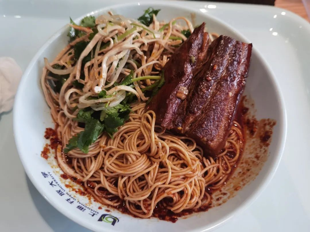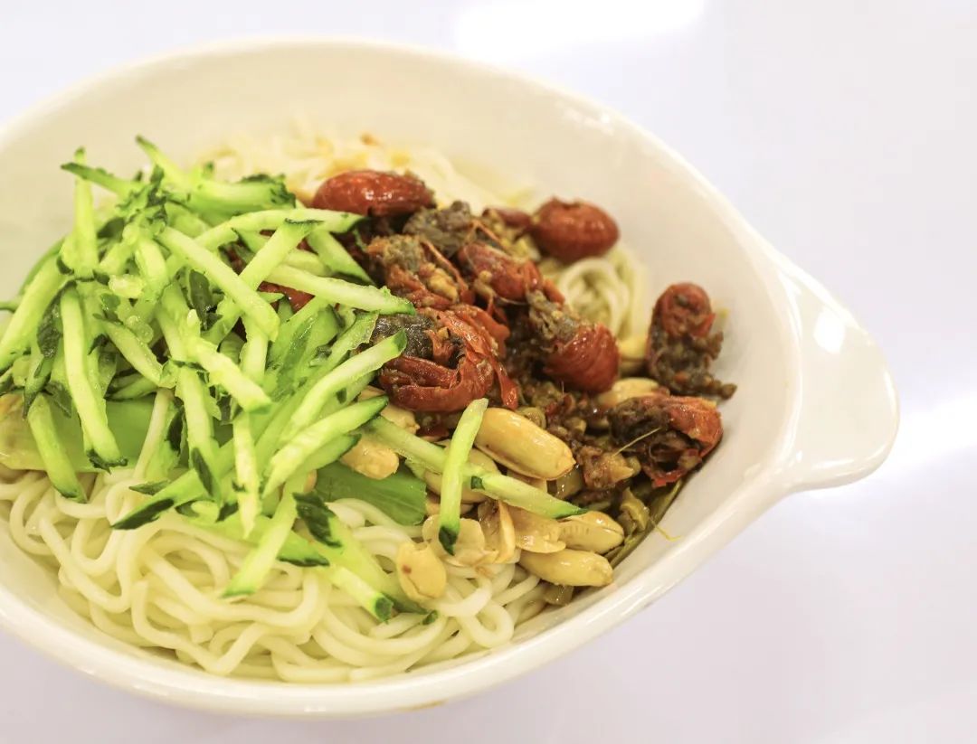 食堂大厨们自制的手工凉皮,配上黄瓜丝、蒜末、花生米,再淋上一把辣椒,酸爽可口。品尝地点: