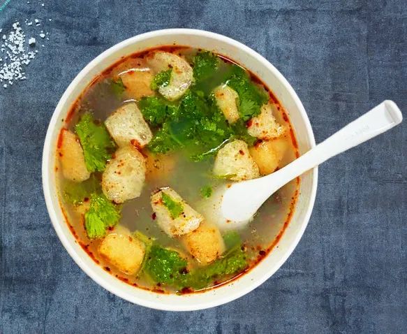 薄薄的蛋皮包着奶油生菜、红边生菜和豌豆苗,给你带来十足的清爽。鸭血粉丝汤