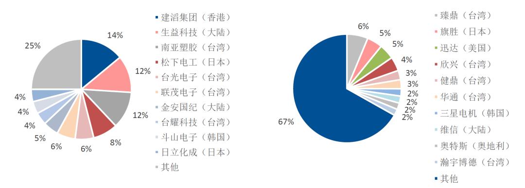 左图:2018年全球前十大覆铜板厂商市占率;右图:2018年全球前十大PCB厂商市占率。来源:Prismark,民生证券。PCB行业下游虽众多,但在通讯、消费电子、汽车电子这三方面主要客户多有垄断性质的例如华为、中兴、苹果这种巨头,像华为更是会指定用哪家的覆铜板,因而PCB厂商的话语权被上下游两头挤压,有的业内公司更像是服务业而非制造业。