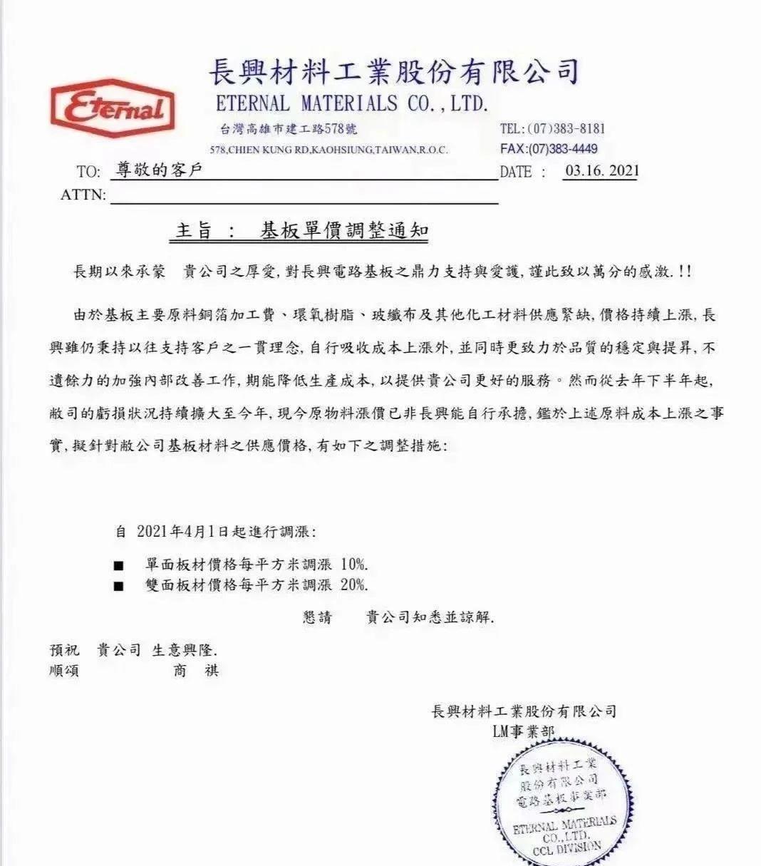 所以,覆铜板厂商已经开始调价,普遍涨价20%左右。