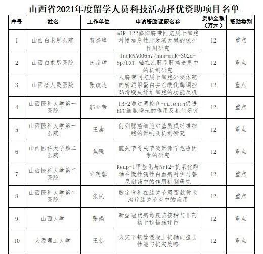 近日,山西省人社厅发布消息:根据《山西省人力资源和社会保障厅关于2021年度留学人员科技活动项目择优资助经费申报工作的通知》(晋人社函字【2021】87号)安排,经专家评审,现将山西省2021年度留学人员科技活动择优资助项目评审结果予以公示。名单如下: