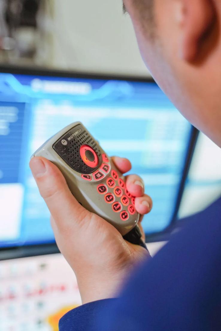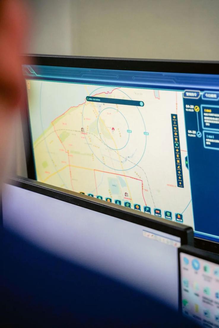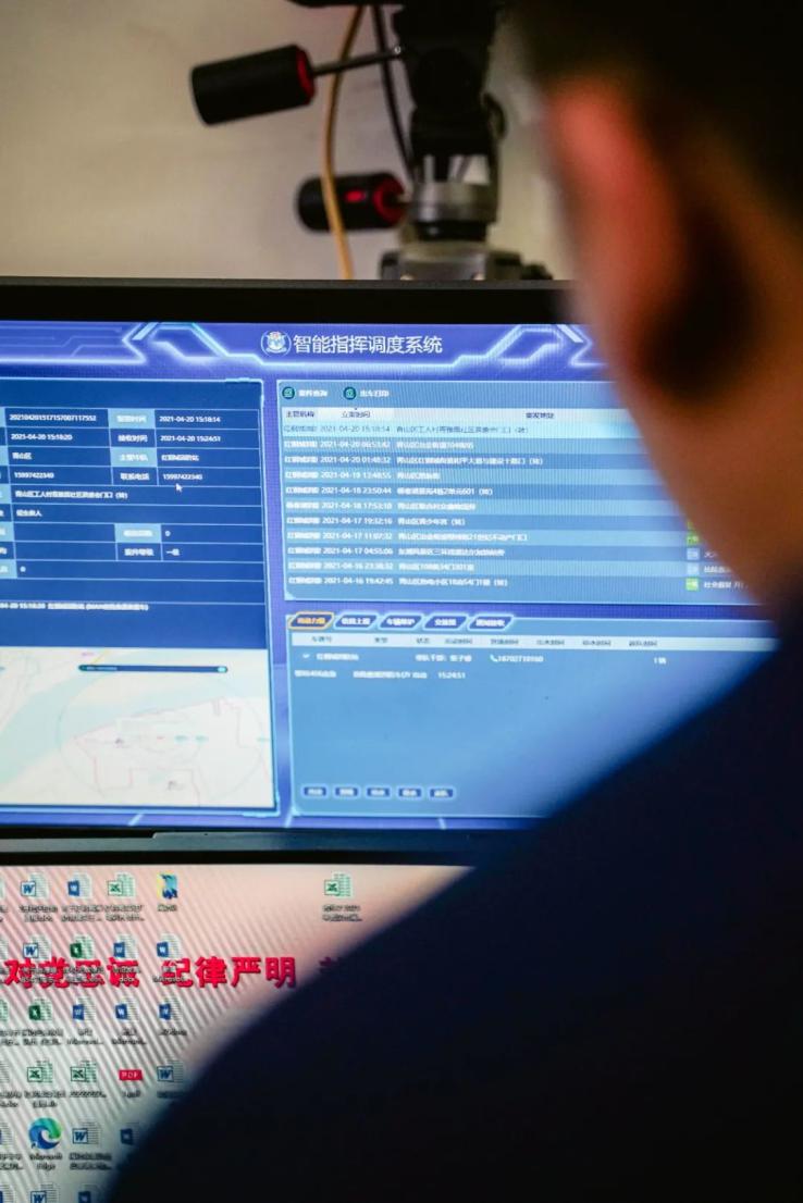 架子上整齐地陈列着物品,敲击键盘与点击鼠标的声音时时传来。青山红钢城站的接警调度室内,一切都在有条不紊地运行着。最显眼的是几块并排拼接在一起的显示屏,看起来它们共同运行着某套系统,独特的界面正发着幽幽的蓝光。