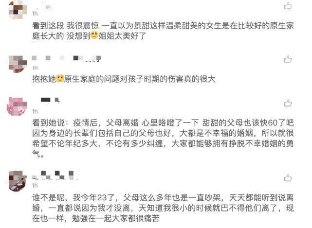 网友们纷纷在评论区里留言表示,看她甜美的富贵花形象,还以为她是从小被爱包围着长大的;还有网友对景甜的悲伤感同身受,留言感慨父母吵架对孩子伤害很大。