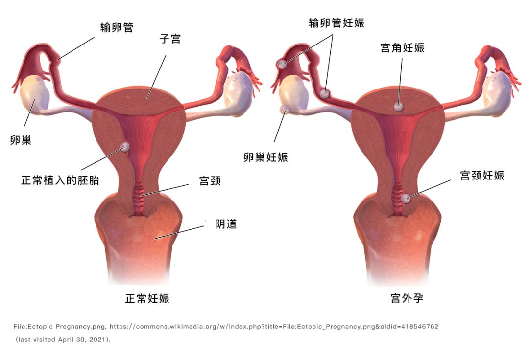 最常见的是输卵管妊娠,占比达95%,其他还有卵巢妊娠、腹腔妊娠、宫颈妊娠等[1]。