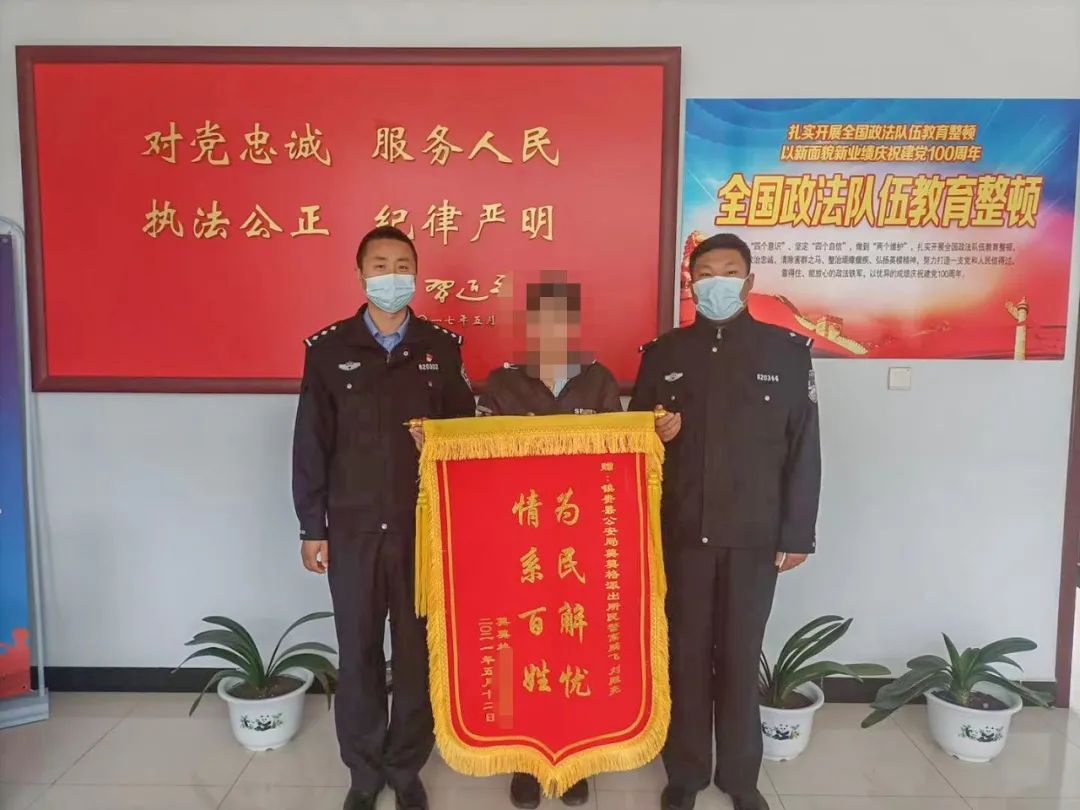 5月14日下午,村民刘某高兴地来到镇赉县公安局莫莫格派出所,将一面印有“情系百姓为民解忧”的锦旗送到了民警刘殿亮和高鹏飞的手中,对民警为其找回遗失的种子,及时挽回经济损失表示感谢。