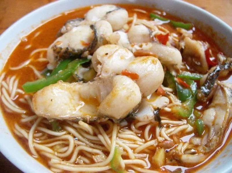财鱼其实是黑鱼,味道鲜美还有助于伤口愈合,滑嫩的财鱼切成片加工盖在面上在潜江是过早界的扛把子,其特色在于味道鲜美。首先,财鱼一定要当天现杀,将大条财鱼制成鱼片,稍稍码味之后,大火快炒,用葱蒜酱油调味,加番茄和青椒调味,最后加汤烧成鱼汤再配上筋道的面条。