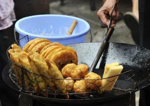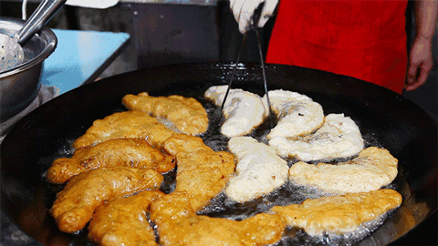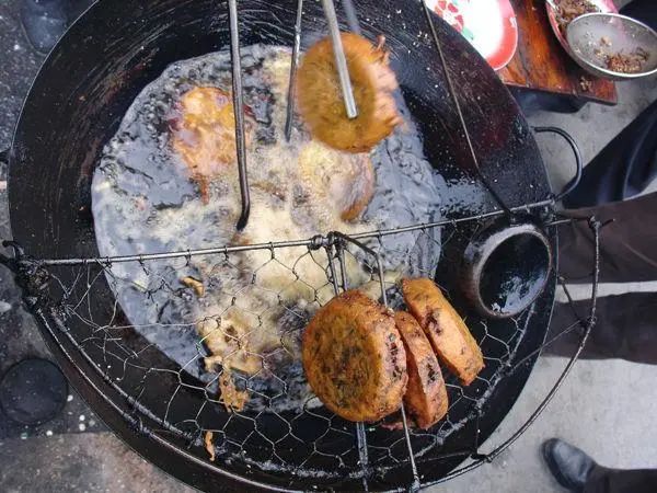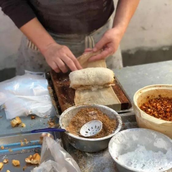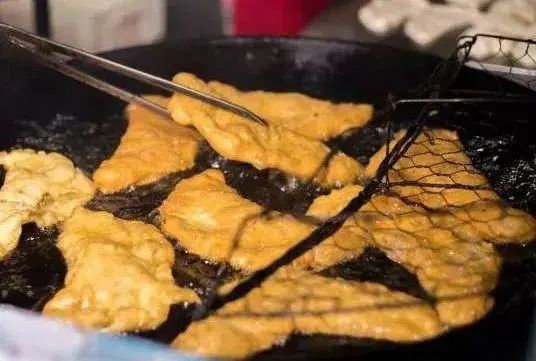 将大米、黄豆按一定比例和好,用水浸泡一个晚上,次日用石磨磨成糊状放入桶中,再用特制的铁勺盛装,一般加上肉丝、土豆丝、洋葱、大蒜、花椒等佐料在锅中煎炸而成(内馅每家店都略微不同)。炸好的油香儿控油后呈深红色,清香可口。到了武汉,各家会在中间略微凸起的勺子里倒满面浆,放入油锅慢慢炸酥,只是中间没有镂空,就改名为“面窝”。03 | 糖酥饺
