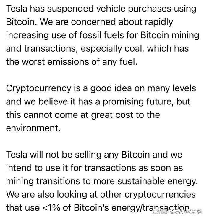 马斯克的原文再次翻译:“特斯拉已经停止使用比特币购买汽车。我们非常关心比特币挖矿与交易中快速增长的化石能源,尤其是煤炭,它会产生任何能源中最糟糕的排放。加密货币在很多领域是一个好的注意,我们相信它有一个光明的未来,但我们不能接受对环境如此大的消耗。特斯拉未来不会卖出任何比特币,当它使用更多绿色能源时,我们会尝试去使用它进行交易。我们目前正在寻找使用小于比特币1%能耗的加密货币。”