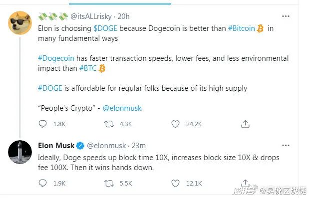 5月13日,马斯克因为比特币消耗化石能源过大,暂停特斯拉对比特币支付的支持。随后援引剑桥数据,称比特币快速增长的耗能是疯狂的。一时间币圈人人对马斯克口诛笔伐,赵长鹏甚至取消了关注。5月16日马斯克在一条表示“狗狗币比比特币更好”的推文下称,要将狗狗币手续费降低100倍。