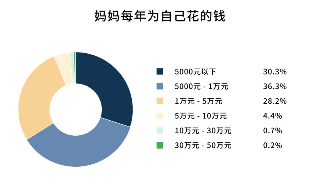 数据来源:《2021年中国妈妈生存报告》《2021年中国妈妈生存报告》显示,绝大部分妈妈都没有把钱花在自己身上。家庭最大的开销就是还房贷和给孩子报培训班,其次是医疗支出和旅游支出。三分之二的中国妈妈每年为自己花费不到1万元。