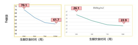 生酮饮食10周减重8.4公斤,其中脂肪6.9kg,占82%。BMI由26.1kg/m2到22.9 kg/m2,身材变苗条,脸上的痤疮也消失了,月经变得按时来,如期走。脂肪肝也消失了。