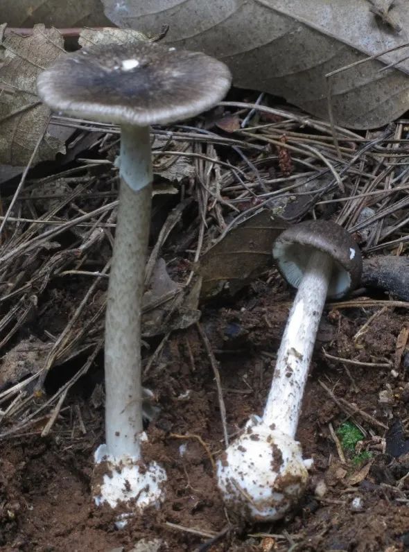 假褐云斑鹅膏:菌盖6-15厘米,淡灰色、灰色至灰褐色,具深色纤丝状隐生花纹。菌柄白色,常被白色纤毛状至粉末状鳞片,近顶部常具有菌环。菌柄基部有菌托,浅杯状。常生于阔叶林或者针阔混交林中地上。