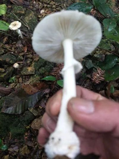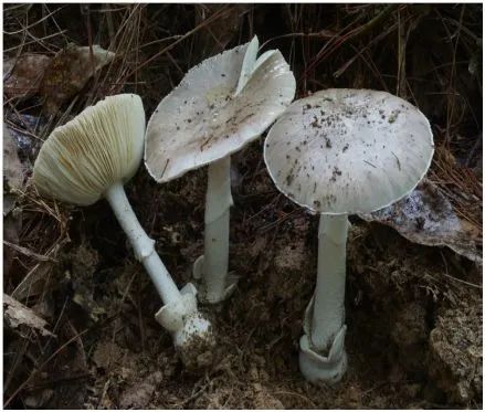 (假褐云斑鹅膏)欧式鹅膏:菌盖4-8厘米,纯白色至米白色,边缘无沟纹。菌柄白色,常被白色反卷纤毛状或绒毛状鳞片,基部腹鼓状至白萝卜状。菌环上位,白色。菌托浅杯状,白色。常生于阔叶林、针叶林或者针阔混交林中地上。