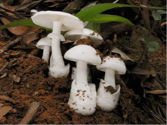 (肉褐鳞环柄菇)2.急性肾衰竭型:潜伏期8-12小时,后出现呕吐、腹泻、腹痛,1-4天出现肝肾损害,如肝酶升高、少尿无尿等。我省引起肾衰的鹅膏种类:假褐云斑鹅膏、欧式鹅膏等。