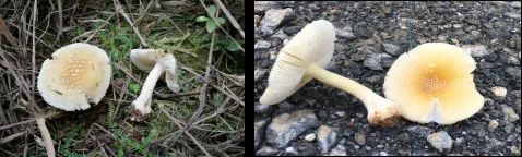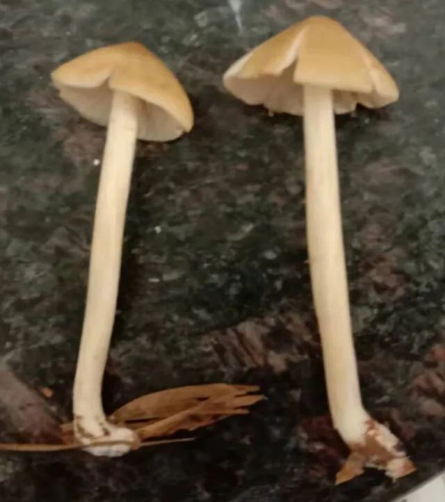 (注:左图为灰花纹鹅膏,右图为裂皮鹅膏)条盖盔孢伞:2-6厘米,黄褐色,中央稍下陷,且具有小乳突,菌盖具有明显辐射状沟条。菌柄顶部黄色,向下颜色逐渐变深,基部黑褐色,常生于腐殖质或者腐木上。