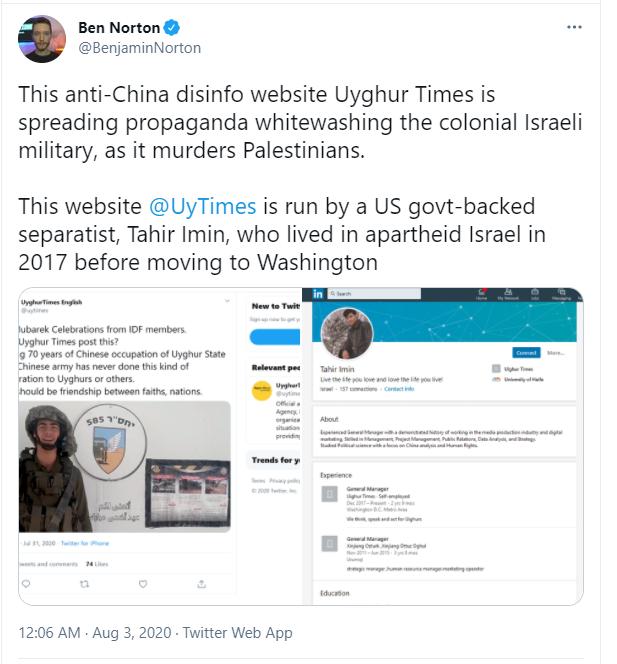 去年有外国网民还曾扒皮发现,该账号背后一个被美国政府资助的运营者Tahir Imin,在多年前离开新疆后,曾在以色列生活过一段时间,然后才去的美国。