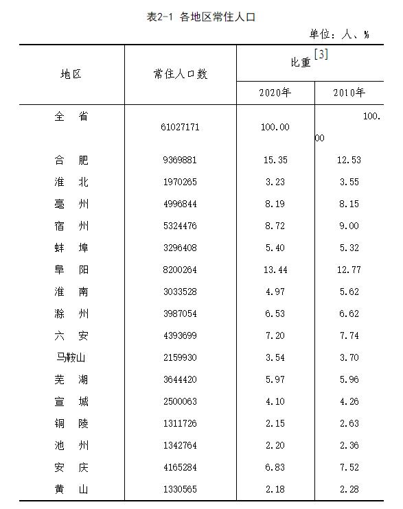 安徽总人口全省常住人口为6102.7万人,比第六次人口普查增加152.7万人,增长2.57%,年均增长0.25%。数据表明,十年来安徽省人口保持平稳增长。