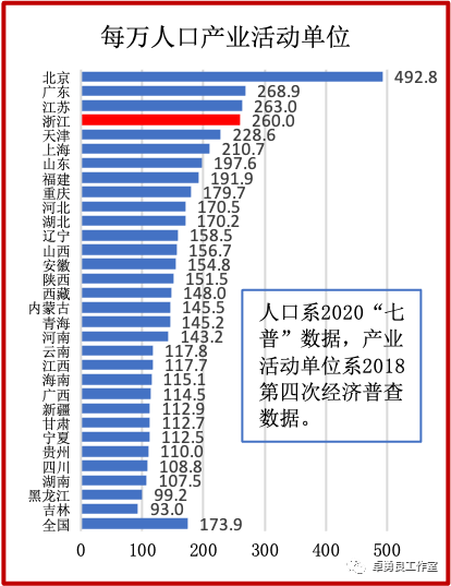 一是浙江经济具有创造较多就业的强劲活力。浙江企业密度居全国前列,根据第四次经济普查和“七普”人口的计算,2018年浙江每万人产业活动单位260家,居北京、广东和江苏之后的第4位,前3位分别是北京、广东和江苏。