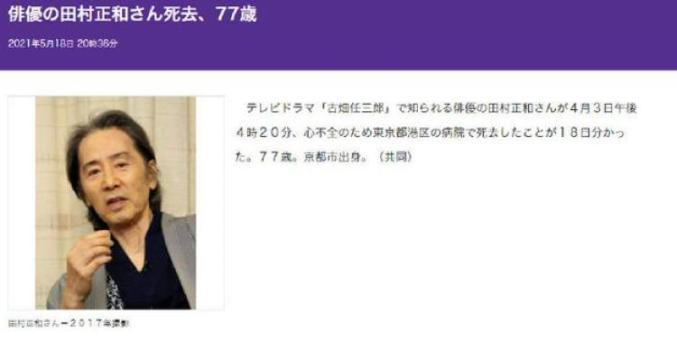 5月18日晚间,据日本媒体“每日体育摘要”(Sponichi Annex)率先报道,日剧《古畑任三郎》的主演、知名演员田村正和已于当地时间4月3日下午4点20分在东京的一家医院因心力衰竭去世,享年77岁。