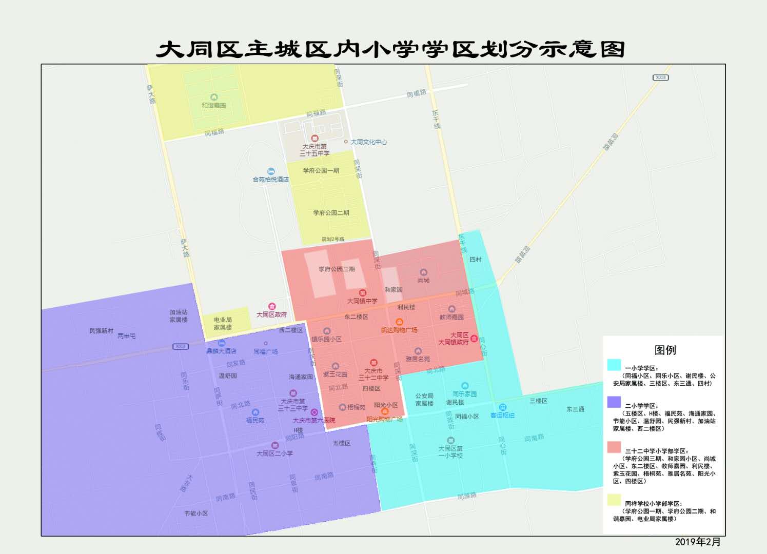 根据大同区教育局2019年2月18日《大同区学区及小升初学校调整方案》公告,大同区主城区内小学学区划分如下: