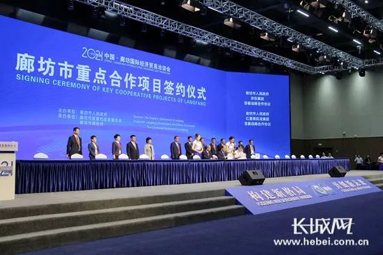 2021中国·廊坊国际经济贸易洽谈会廊坊市重点合作项目签约仪式现场。长城网记者 祝雪娟 摄签约仪式共签署战略合作协议12项,签署重点合作项目53项。其中央企合作项目18项,总投资284.2亿元,主要有中信海洋直升机股份有限公司在廊坊临空经济区投资50亿元建设无人机华北产业园项目、华润电力投资有限公司华北分公司在文安县投资30亿元建设“碳达峰、碳中和”多能融合产业集群项目、北京金茂绿建科技有限公司在香河县投资30亿元建设中化金茂数字创新产业基地项目等。