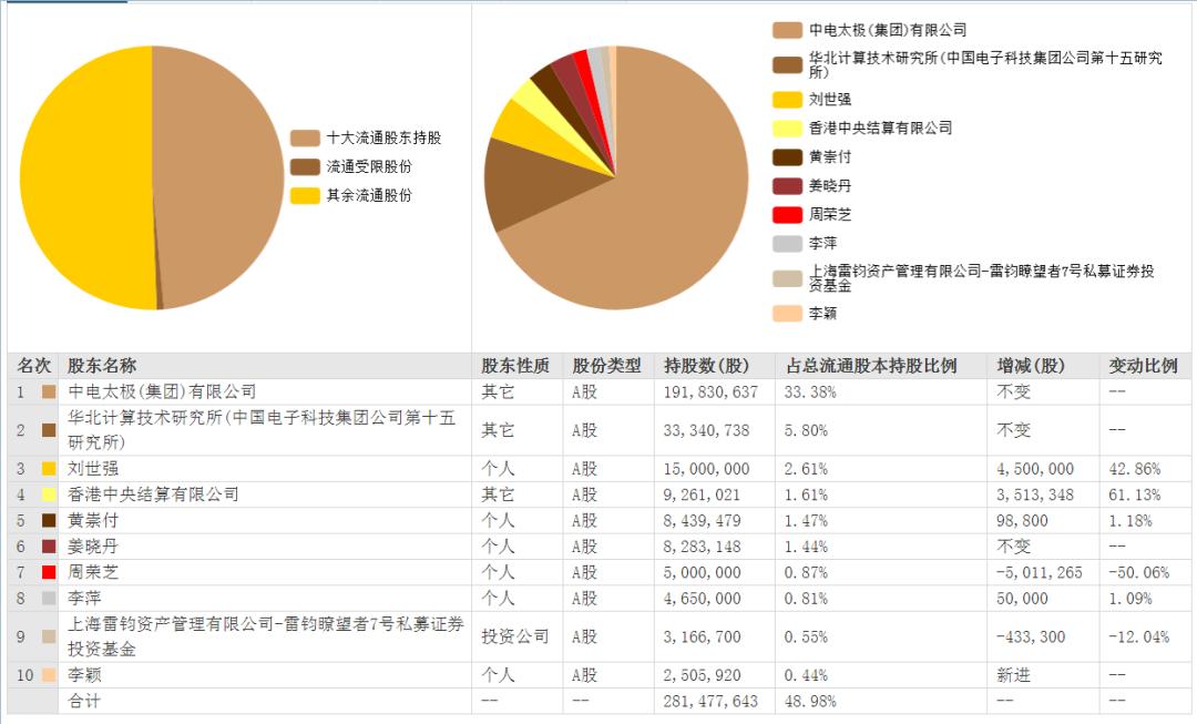 公开资料显示,太极股份成立于1987年,2010年3月于深交所上市,主营业务为面向政务、公共安全、国防、企业等行业提供信息系统建设和云计算、大数据等相关服务,涵盖信息基础设施、业务应用、数据运营、网络信息安全等综合信息技术服务。值得注意的是太极股份一季报中披露的前十大股东。上述股东名单的个人投资者中,除了位列第6的姜晓丹为太极股份前董事长,且已于2017年离职之外,其余5人(刘世强、黄崇付、周荣芝、李萍、李颖)均为投资人,也是我们惯常所称的“牛散”。