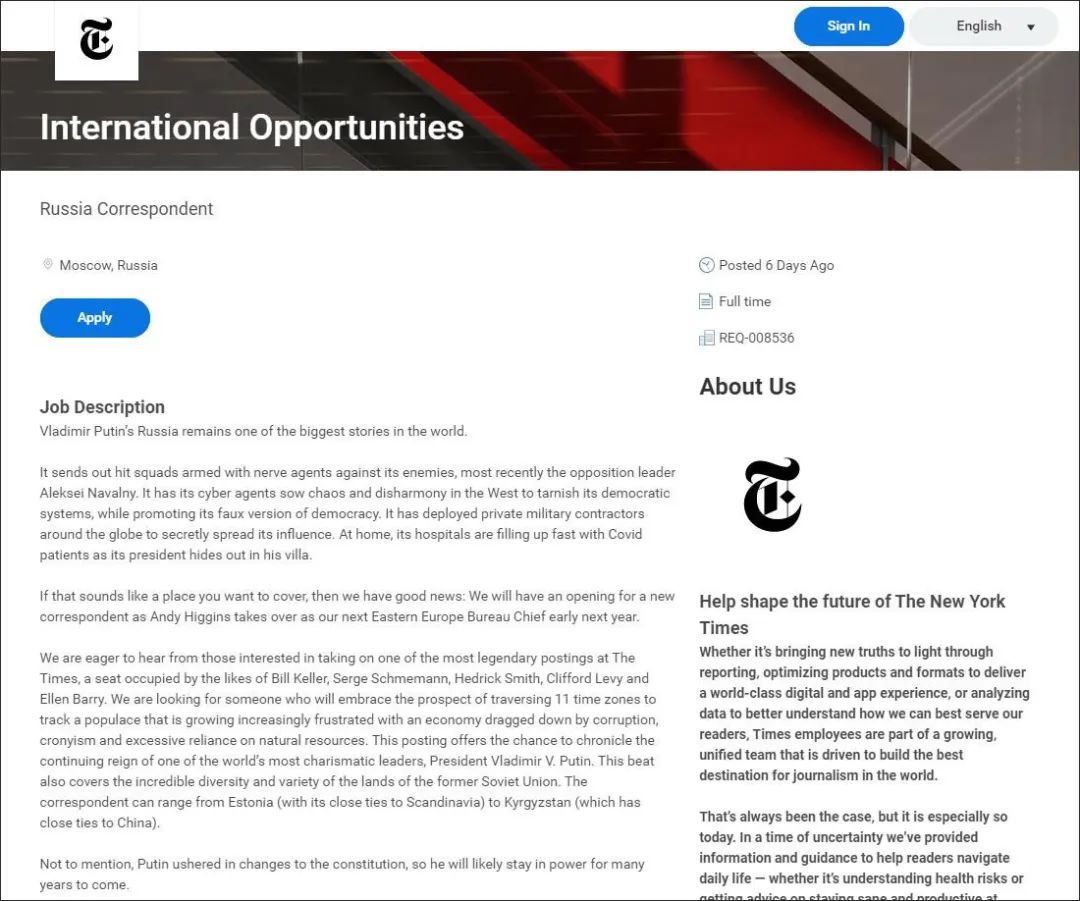 《纽约时报》招聘驻俄记者广告(截自该报社网站)后来这条广告在推特上成了许多人的笑柄。在美国当记者就是这样,你得通过意识形态测验才能成为记者,基本意味着你得是个极端主义者。尽管报道俄罗斯的时候确实需要批判地看待许多事情,但他们根本不允许你正反两方面都提到。