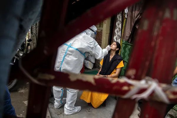2021年5月17日,印度医务人员在高哈蒂为一名女子进行鼻咽拭子取样。图|新华社三是病毒的致病模式有明显变化。