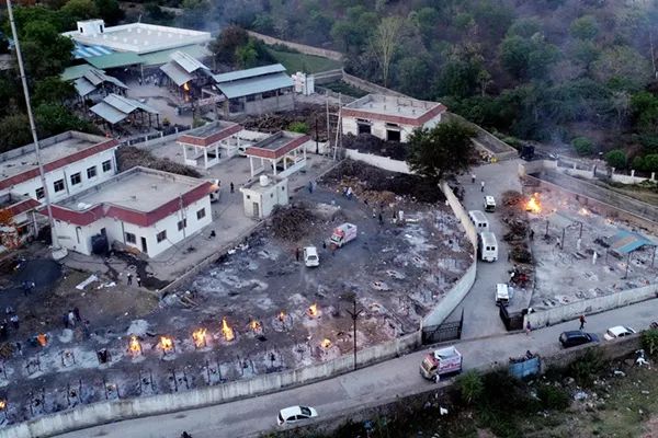 2021年4月23日,印度城市博帕尔火葬场在焚化尸体。由于疫情导致死亡病例持续增加,印度多地火葬场不堪重负,痛失亲人的家庭需排队数日才能把亲人遗体火化。图|新华社3