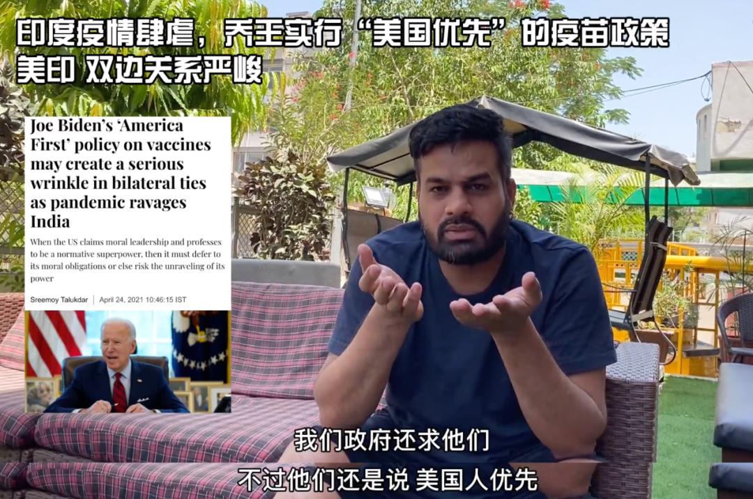 图片来源:B站UP主“印度三哥MANU马怒”如果说“牛尿疗法”只是错误宣传,那么印度政府在疫情中过分追随美国而对华疏远的政策,也在印度社会引发了不满。尽管中国政府早已主动表达援助印度的意愿,印度政府却要面子不要里子,以人命为代价拖延援助,至今仍不愿批准中国疫苗进口,但另一方面又受到盟友美国的疫苗原料出口限制,面临巨大的疫苗缺口。对此,一些民众在谴责“美国优先”政策的同时,也批评莫迪政府存在严重的决策失误。