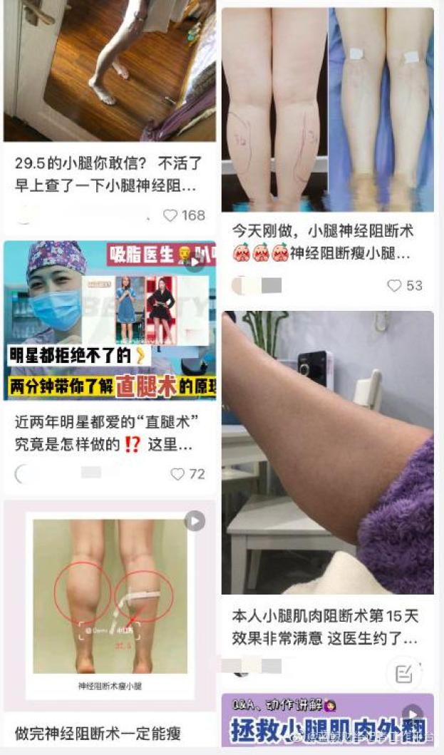 5月18日,有网友做了“小腿肌肉阻断术”,并发在社交平台进行分享。该帖称,这项手术可以让肌肉慢慢萎缩,从而达到永久瘦小腿的效果。在某社交平台上,“小腿肌肉阻断术”也有着很高的人气和推荐度,上万人点赞“种草”。不少博主亲身体验并表示,做了之后轻轻松松就能瘦下来。