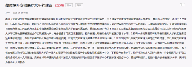 安青网讯近日,有网友在人民网“领导留言”板块发布了题为“整体提升安徽医疗水平的建议”的内容: